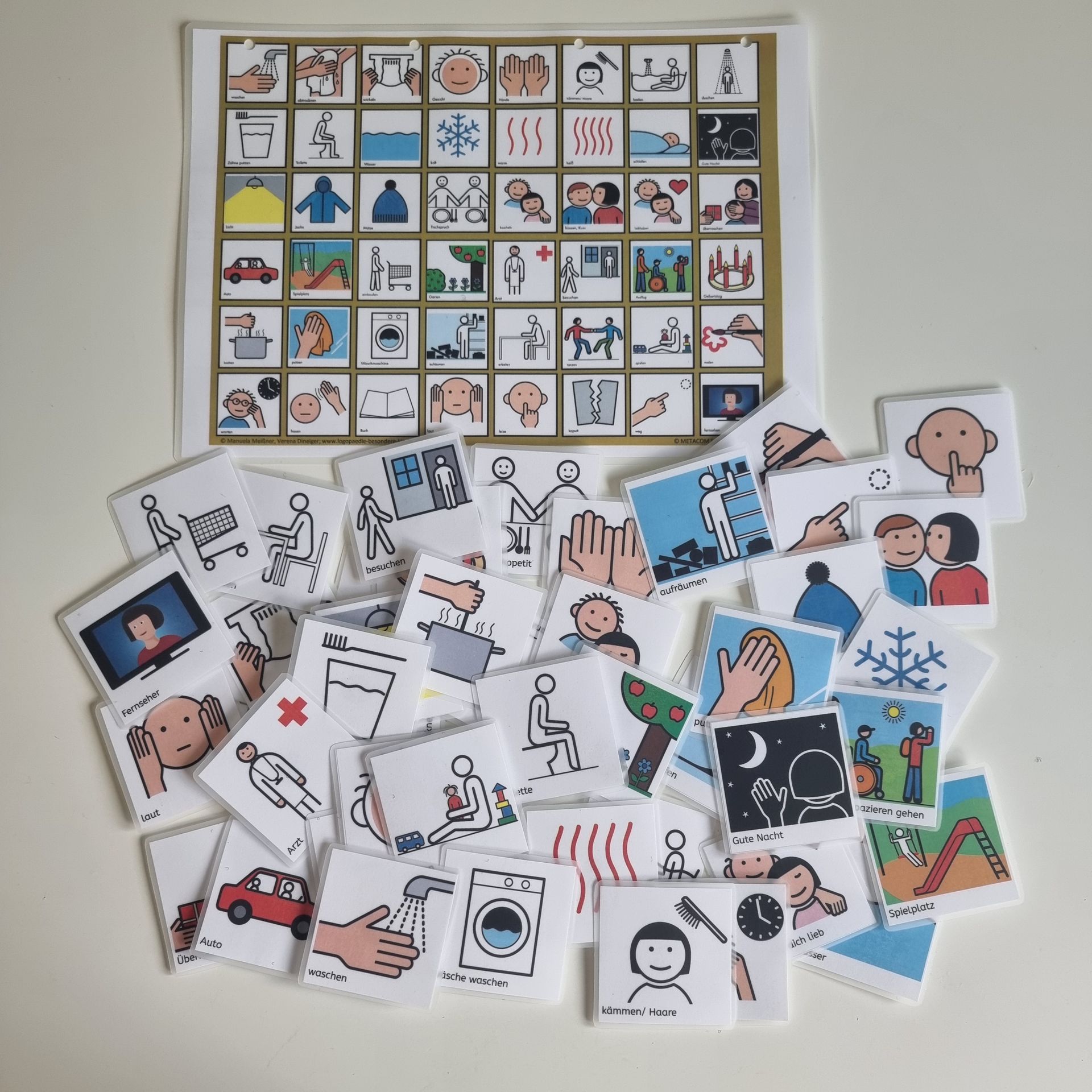 Weiterhin beinhaltet das KommuBiS Starter-Set 48 METACOM-Symbole ©Annette Kitzinger aus dem Kern- und Randvokabular (Spielsachen, resultative Verben, Wörter aus dem kindlichen Wortschatz, unsere Kernwortschatzleiste - alle mit Rand matt laminiert, zum Selbstausschneiden mit Klettpunkten) und eine Tafel mit allen enthaltenen Symbolen, um den Übergang zum Zeigen zu erarbeiten.