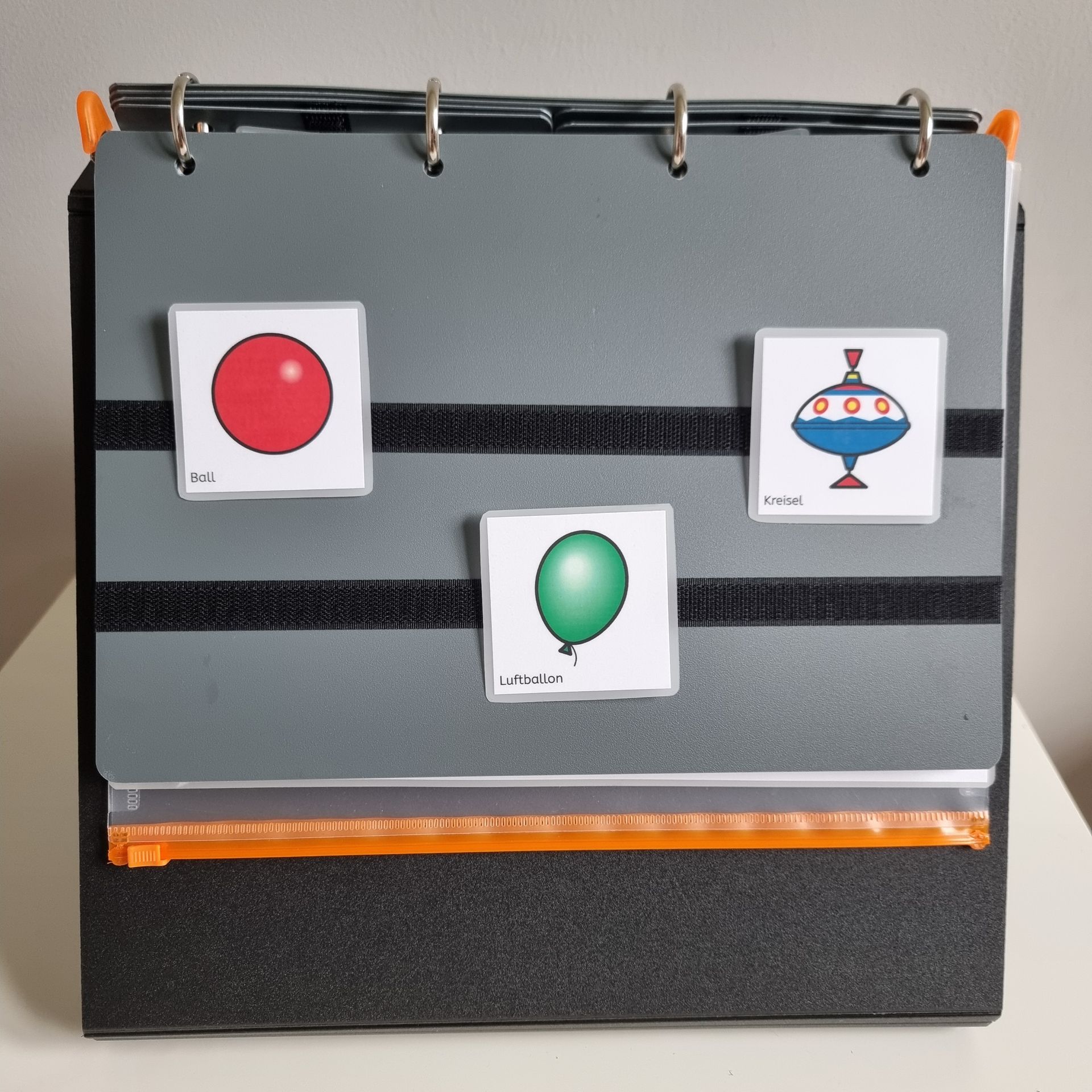 Die Symbole sind alle mit Klettpunkten bestückt (zum Selbstaufkleben), so dass auf den Klettstreifen in der Mappe verschiedene Positionen möglich sind.