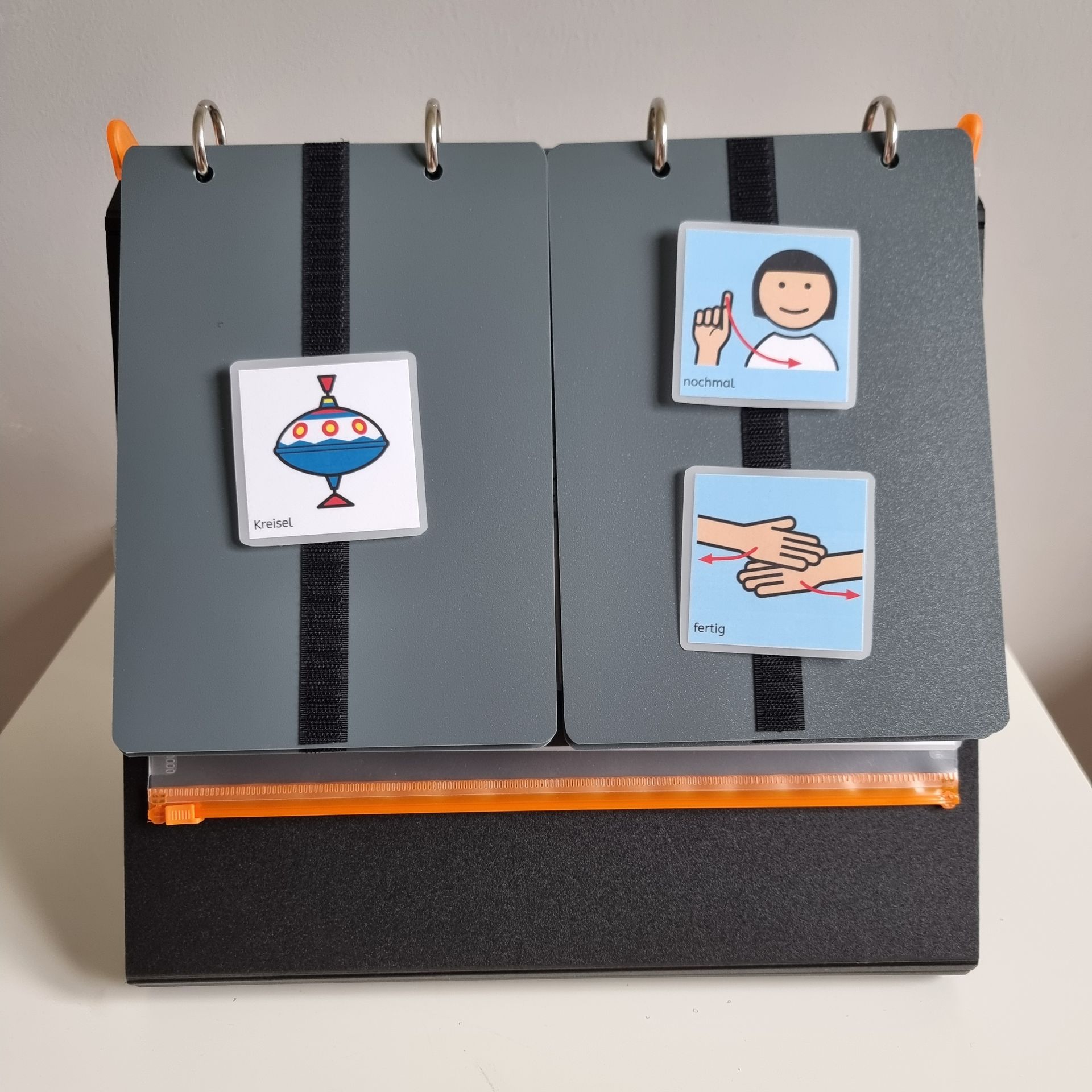 Es enthält vier stabile DIN A5 Plastikseiten (abwischbar), die jeweils zu zweit nebeneinander angeordnet sind, so dass man z.B. die resultativen Verben in direkter Gegenüberstellung anbieten kann. Außerdem sind fünf stabile DIN A4 Seiten mit Klett und eine Hülle, um Symbole, die man nicht so häufig benötigt, sicher zu verstauen, enthalten. Die Seiten sind alle mit Klett versehen, um auch ein Übergeben der Symbole zu ermöglichen.